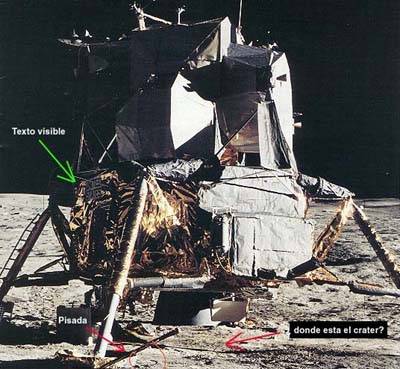 Foto 1: se trata del Apolo 14. Supuestamente, al posarse en la Luna, el módulo lunar debió dejar un gran cráter entre sus patas por efecto de su enorme peso, sin embargo en la fotografía no existe tal cráter. Además se observa que junto a una de las patas del módulo lunar hay una pisada, y hay que tener en cuenta que en esa zona de la Luna nadie había estado antes. Por último, en el módulo lunar se leen las palabras United States, cuando al estar en sombras, y teniendo en cuenta que en la Luna, según confirman todas las teorías científicas, la oscuridad es absoluta, no deberían poder leerse sin la luz directa del Sol.